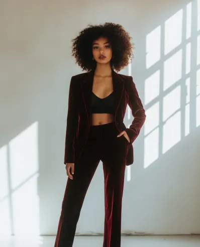 This burgundy velvet suit is all about making a bold fashion statement with a luxurious feel. The rich texture of the velvet instantly elevates the classic tailored suit, while the cropped black top underneath adds a contemporary edge. Paired with sleek black heels, this outfit is both daring and elegant, perfect for a night out or a fashionable event. The structured blazer and high-waisted trousers elongate the figure, giving it a confident, powerful vibe.