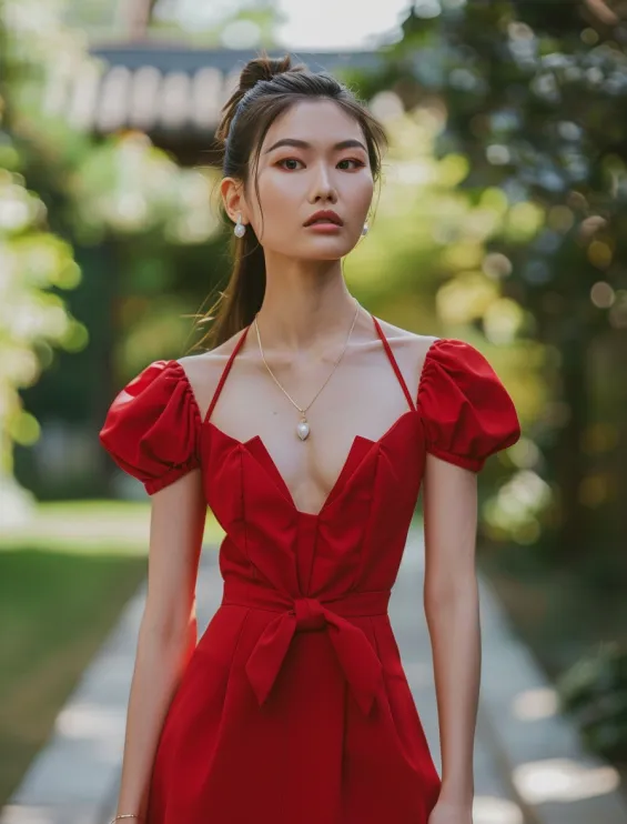 A bold cherry red mini dress with puff sleeves and delicate halter straps is the perfect mix of sweet and sultry. The fitted bodice, deep neckline, and waist-cinching bow detail create a flattering, feminine silhouette. With its structured shape and playful accents, this look is ideal for summer garden parties, date nights, or any moment that calls for a little extra charm.