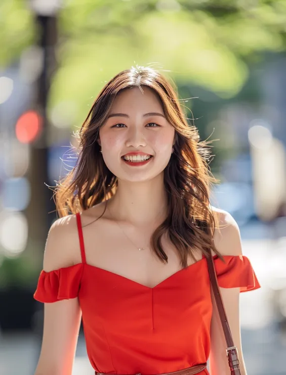A playful cherry red sundress with delicate off-the-shoulder sleeves is the perfect blend of flirty and feminine. The sweetheart neckline adds a touch of romance, while the fitted waist with a slim belt enhances the silhouette. The flowy skirt moves beautifully, making this dress ideal for sunny day adventures, weekend brunches, or an afternoon in the city.