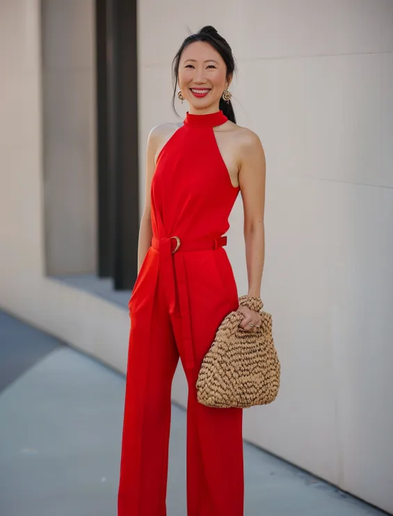 A cherry red halter jumpsuit brings effortless elegance with a modern edge. The high neckline adds a chic touch, while the wide-leg silhouette keeps things breezy and flattering. A matching fabric belt cinches the waist, creating a beautifully defined shape. Paired with gold sandals and a woven handbag, this outfit strikes the perfect balance between dressy and laid-back, making it ideal for summer events or stylish city outings.