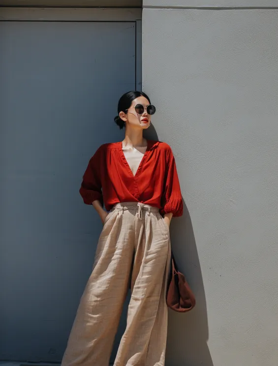 An airy cherry red blouse with billowy sleeves pairs beautifully with wide-leg linen pants for the ultimate relaxed summer look. The deep V-neckline and lightweight fabric make this top effortlessly chic, while the high-waisted trousers add a breezy elegance. Paired with simple sandals, a slouchy brown bag, and oversized sunnies, this outfit is all about understated sophistication.