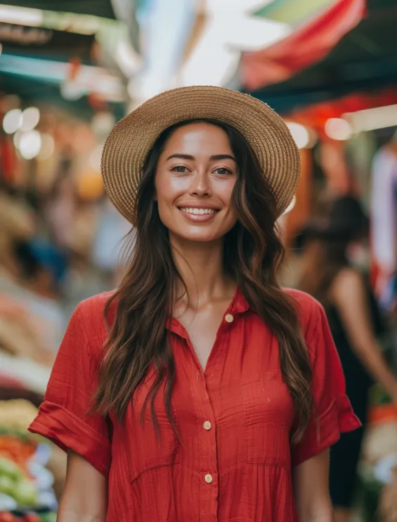 A relaxed cherry red button-up dress with rolled sleeves is the perfect throw-on-and-go summer essential. The lightweight, crinkled fabric gives it a breezy, effortless feel, while the wooden buttons add a touch of rustic charm. Topped off with a classic straw hat, this look is made for market strolls, beachside cafés, or any warm-weather adventure.