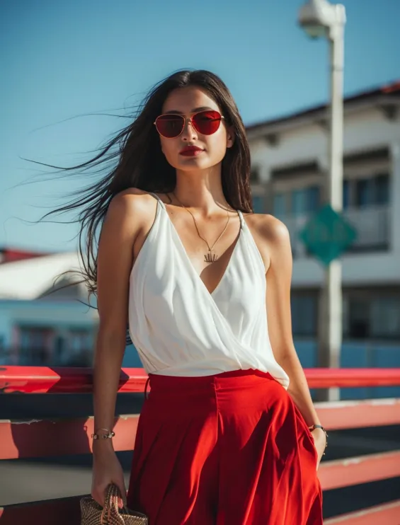 A breezy white wrap top meets bold cherry red wide-leg pants for a summer look that s effortlessly stylish. The deep V-neckline and delicate straps give the top an airy, relaxed feel, while the high-waisted trousers add just the right amount of drama. Red-tinted sunglasses and a woven sunhat complete the look, making it perfect for seaside strolls, brunches, or any day that calls for a little extra confidence.