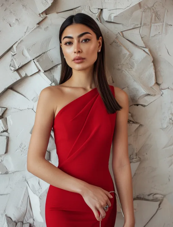 This cherry red one-shoulder bodycon dress is the definition of sleek sophistication. The asymmetric neckline adds a modern edge, while the soft draping detail gives it that effortlessly polished touch. The figure-hugging silhouette creates a refined yet bold statement, perfect for summer weddings, rooftop cocktails, or any night that calls for turning heads. A sparkling mini clutch adds just the right hint of glam without stealing the spotlight.