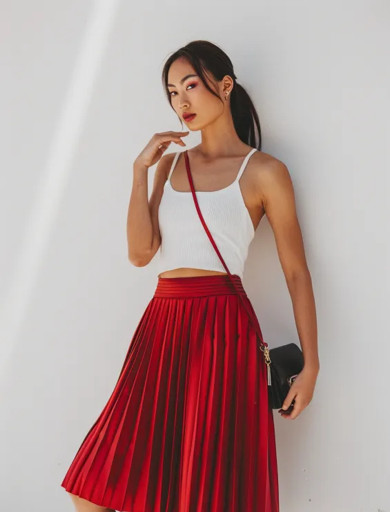 Chic Pleated Red Skirt With a White Tank
