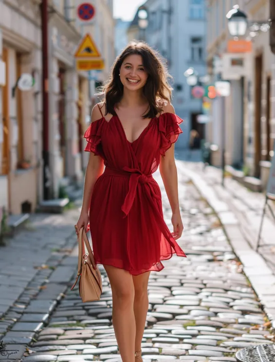 A dreamy cherry red dress with smocked detailing and delicate ruffled off-the-shoulder sleeves brings all the effortless romance. The fitted bodice enhances the waistline, while the flowy skirt adds graceful movement. Thin spaghetti straps keep it light and airy, making it perfect for summer evenings, garden parties, or a European-inspired city stroll.