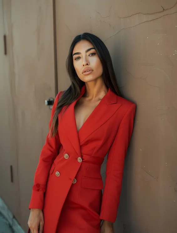 A structured cherry red blazer dress takes power dressing to the next level. The tailored fit, deep V-neckline, and gold button details create a bold yet sophisticated look. The sharp lapels and cinched waist enhance the figure, while the short hemline keeps it fresh and flirty. Paired with a matching red handbag and minimal jewelry, this outfit is pure confidence in clothing form.