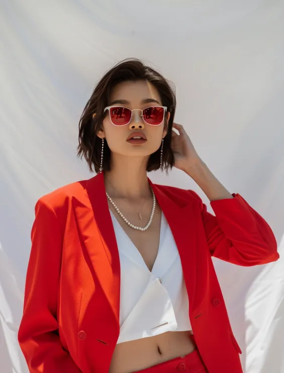 A vibrant cherry red suit paired with a crisp cropped white top is the perfect mix of power and playfulness. The oversized blazer adds a touch of effortless cool, while the tailored trousers keep the look sleek. Red-tinted sunglasses and pearl accessories bring in a little extra attitude, making this the ultimate summer statement outfit for brunches, rooftop parties, or just serving looks wherever you go.