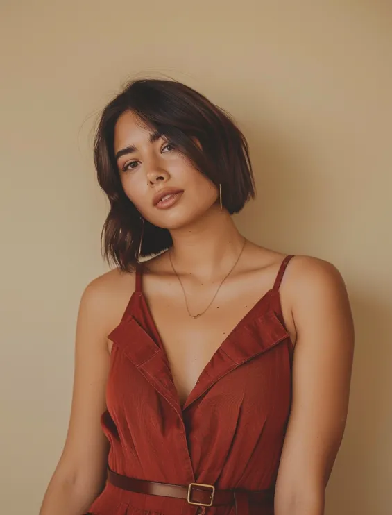 A flowy deep cherry red romper with delicate spaghetti straps is the ultimate mix of relaxed and refined. The ruffled neckline adds a subtle touch of femininity, while the cinched waist with a sleek belt creates a flattering silhouette. The lightweight fabric makes this outfit perfect for warm summer days, effortlessly blending comfort and style.