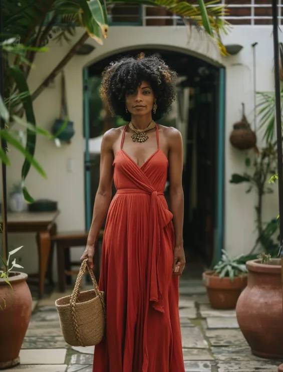 A stunning cherry red maxi dress with a wrap-style bodice and delicate spaghetti straps is the definition of effortless summer elegance. The flowing fabric drapes beautifully, creating soft movement with every step. A self-tie waist accentuates the silhouette, while the deep neckline adds a subtle, romantic touch. Paired with earthy accessories like a woven tote and statement jewelry, this outfit is perfect for sun-drenched vacations, outdoor markets, or warm evening strolls.