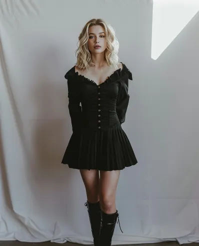 There s something so effortlessly cool about this outfit. The off-shoulder design brings a touch of romance, while the pleats keep it fun and flirty. It s perfect for a night out or even a themed event where you want to channel a dark, stylish aesthetic. Plus, those boots? They add just the right amount of attitude to complete the whole look.