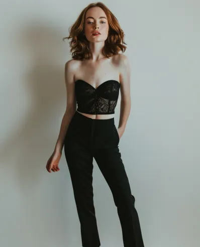 This outfit is the definition of timeless elegance, featuring a delicate black lace corset paired with sleek, high-waisted tailored trousers. The strapless corset creates a flattering silhouette, while the fitted trousers bring a sophisticated edge. Metallic open-toe heels add a subtle touch of glam, making this look effortlessly chic.