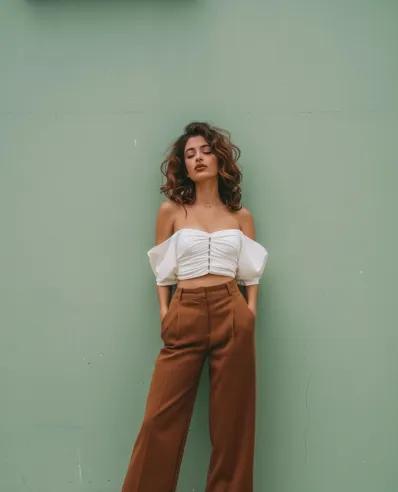 This look features a chic off-shoulder white corset with delicate ruched details, perfectly paired with high-waisted brown cropped trousers. The structured fit of the corset balances beautifully with the relaxed yet polished silhouette of the pants. Nude strappy heels complete the outfit, adding just the right amount of sophistication and elongating the legs.