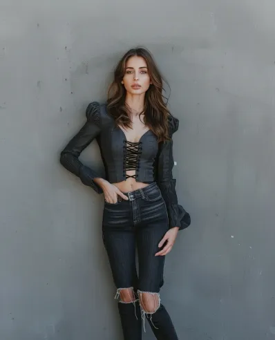 This outfit brings a modern edge with a black lace-up corset featuring dramatic puffed sleeves, paired with high-waisted ripped skinny jeans. The structured top adds a touch of vintage flair, while the distressed denim keeps things fresh and contemporary. Pointed-toe heels tie it all together, giving the look a sleek, elongated finish.