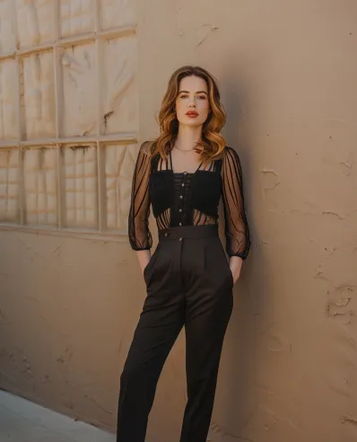 This outfit combines a structured black corset with delicate sheer sleeves and tailored high-waisted trousers, creating an effortlessly polished and modern look. The sheer fabric adds a touch of softness, while the corset s lace-up front keeps things edgy. Paired with pointed-toe heels, this outfit strikes the perfect balance between sophisticated and bold.