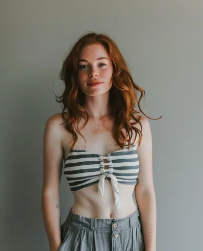 This casual yet stylish outfit features a striped bandeau-style corset with cute tie-front details, paired with loose-fitting linen pants in a soft neutral tone. The lightweight fabrics create an effortlessly breezy vibe, perfect for warm weather days. The relaxed fit of the pants balances out the fitted top, giving off an easygoing yet put-together feel.