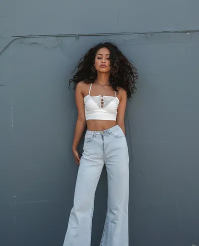 This fresh and modern look pairs a crisp white corset top with high-waisted wide-leg jeans, creating a flattering and effortlessly cool silhouette. The fitted corset accentuates the waist, while the relaxed jeans add a laid-back vibe. Nude block-heeled sandals finish off the outfit, adding just the right amount of height without sacrificing comfort.