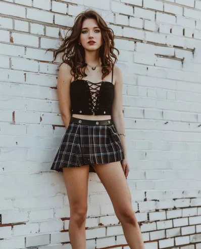 This outfit blends a black lace-up corset top with a classic plaid mini skirt, creating a perfect mix of edgy and playful. The fitted corset hugs the waist beautifully, while the skirt adds a touch of fun with its pleated design. Black ankle boots complete the look, adding a bold and confident vibe. Minimal accessories, like a simple necklace and bracelet, keep the focus on the outfit’s striking details.