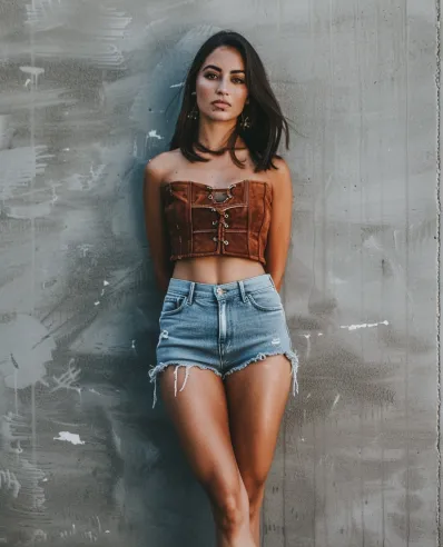This outfit gives off major western vibes with a brown suede corset featuring lace-up details, paired with distressed denim shorts and classic cowboy boots. The corset s texture adds a touch of rugged charm, while the ripped shorts keep things effortlessly casual. Statement earrings complete the look, adding just the right amount of flair.