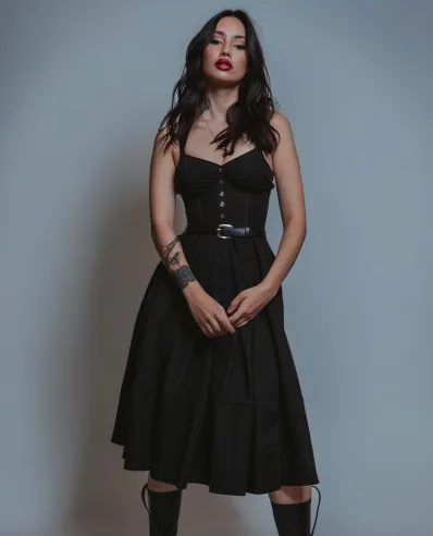 This stunning all-black ensemble features a corset-style dress with button details and a cinched belt that highlights the waist beautifully. The flared midi skirt adds a touch of vintage charm, while the knee-high black boots bring in a bold, modern edge. The overall look balances femininity with just the right amount of attitude.