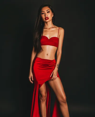 This show-stopping outfit features a fiery red corset paired with a matching high-slit skirt that flows effortlessly with every step. The sleek, form-fitting top accentuates the waist, while the dramatic slit adds a sultry touch. Strappy metallic heels complete the look, adding just the right amount of sparkle without overshadowing the bold red statement.