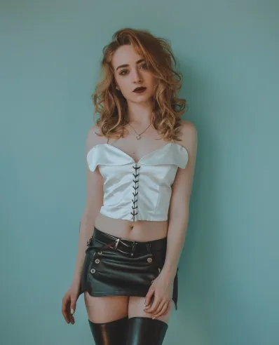 This striking outfit pairs a white off-shoulder corset with a black leather mini skirt featuring eyelet details and a statement belt. Thigh-high leather boots add a bold touch, creating a sleek and confident vibe. The corset s structured fit contrasts beautifully with the edgy elements of the skirt and boots, making it a perfect blend of chic and daring.