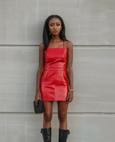 This cherry red leather mini dress is daring, sleek, and oh-so-bold. With its fitted silhouette, thin straps, and structured design, it s a statement piece that s impossible to ignore. Paired with black knee-high boots and a minimalist black clutch, the outfit strikes the perfect balance between edgy and refined. Whether you re heading to a concert or a night out on the town, this look ensures you ll turn heads.