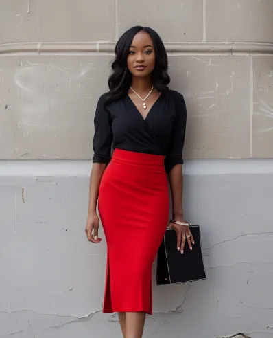 This cherry red pencil skirt is a timeless piece that exudes confidence and elegance. With its high-waisted, fitted design and subtle slit, it creates a sleek silhouette perfect for the office or a dinner date. Paired with a black wrap blouse, delicate jewelry, and nude heels, this outfit is polished and professional yet undeniably chic. The bold red color brings energy, while the classic black top keeps it grounded.