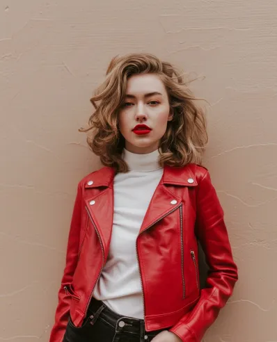 I m obsessed with this look because it s such an easy way to look effortlessly put together while still making a statement. The pop of cherry red from the jacket adds energy without overdoing it, and the clean white turtleneck keeps things fresh and polished. Plus, who doesn t feel like an absolute boss in a leather jacket? This one is equal parts rebellious and refined, and honestly, I d wear it anywhere!