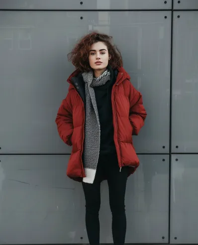 This cherry red puffer jacket is a winter wardrobe essential with a stylish twist. Its oversized fit and plush design make it perfect for staying warm on chilly days, while the bold red color ensures you stand out in a sea of neutrals. Paired with a black hoodie, skinny jeans, a cozy knit scarf, and crisp white sneakers, this outfit is effortlessly cool and practical for running errands or meeting friends on a brisk day.