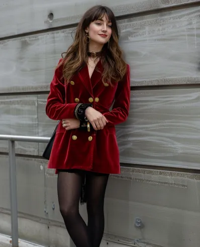 This cherry red velvet blazer dress oozes sophistication with a dash of playful charm. Featuring double-breasted gold buttons and a slightly oversized fit, it strikes the perfect balance between polished and trendy. Styled with sheer black tights, chic ankle boots, and delicate accessories like a choker and hoop earrings, this look is ideal for a night out or a stylish cocktail party.