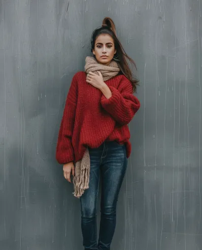 This cherry red oversized knit sweater is everything you need for those crisp fall days. Its chunky texture and relaxed fit make it effortlessly cozy, while the bold red hue keeps it stylish. Paired with dark skinny jeans, a beige scarf, and tan suede boots, this outfit is perfect for a casual walk in the park or a laid-back coffee date. It s all about looking cute while staying warm and comfy.