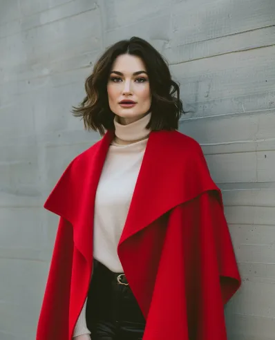 This cherry red cape coat is pure drama in the best way possible. Its oversized collar and flowing silhouette give it a bold, high-fashion vibe, while the soft wool fabric keeps it cozy and practical. Paired with a cream turtleneck, sleek black leather pants, and gold accents, the outfit strikes a perfect balance between chic and edgy. It s the kind of look that turns heads on the street, whether you re headed to brunch or an art gallery opening.