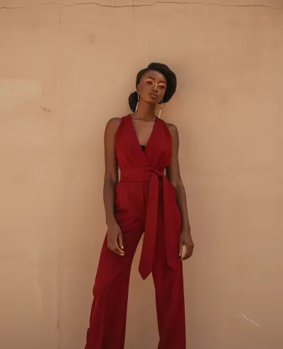 Honestly, I m all about jumpsuits that make dressing up feel so easy, and this one does it perfectly. The cherry red shade is bold but not overpowering, and the flowy details add just the right amount of drama. It s one of those pieces that makes you feel instantly chic without needing a ton of accessories. If I wore this, I d probably be twirling all night just to show off those wide legs it s that fabulous!