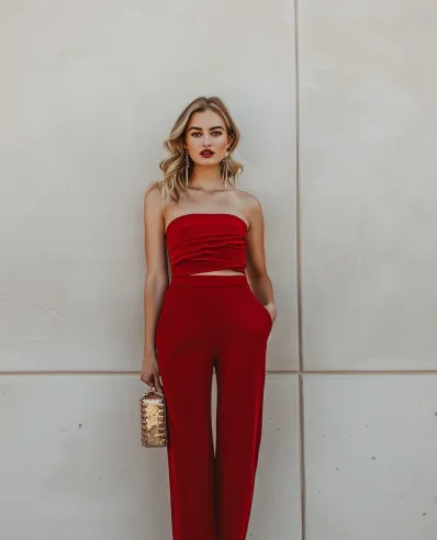 This cherry red strapless jumpsuit is the perfect combination of sleek and chic. The fitted bandeau-style top and high-waisted straight-leg trousers create a streamlined silhouette that s both modern and flattering. Accessorized with metallic heels and a glittering gold clutch, this look radiates effortless glamour, making it ideal for formal events, cocktail parties, or upscale date nights.