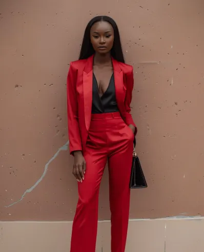 This cherry red power suit is everything you need to make a bold statement. With its impeccably tailored blazer and sleek high-waisted trousers, it s the epitome of modern sophistication. The deep black satin top adds a sultry contrast, while pointed-toe heels and a structured black bag complete the polished vibe. This outfit is perfect for commanding attention at a networking event or stealing the spotlight on a night out.