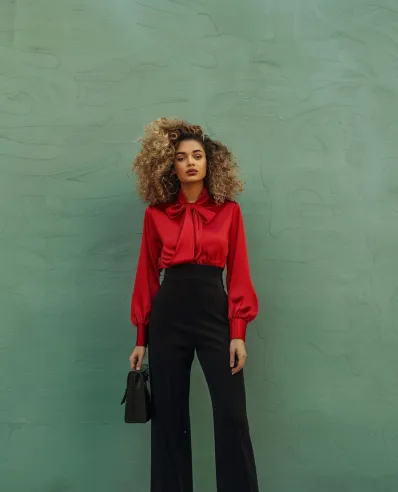 This cherry red satin blouse is the definition of sophisticated chic. With its high neck and flowy bishop sleeves, it strikes a beautiful balance between retro glamour and modern minimalism. Tucked into black high-waisted trousers with a wide-leg cut, the outfit exudes elegance. Add silver heels and a structured black handbag, and you ve got the perfect look for a dinner party, work event, or classy date night.