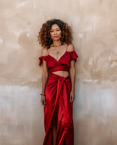 This cherry red satin co-ord set is the perfect mix of romance and glamour. Featuring a cold-shoulder crop top with delicate ruffles and a high-slit maxi skirt tied at the waist, it s both elegant and playful. The silky fabric drapes beautifully, catching the light with every move. Nude strappy heels and layered gold necklaces complete the look, making it ideal for summer weddings, tropical vacations, or any event where you want to dazzle.