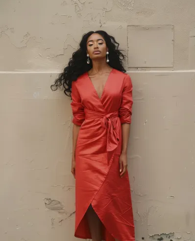 This cherry red wrap dress is pure elegance wrapped in a bow literally! The silky fabric flows effortlessly, and the tied waist creates that snatched silhouette we all dream of. The deep V-neckline adds a touch of sultriness, while the three-quarter sleeves keep it classy. The asymmetrical hemline gives it a modern edge, and the rich cherry red color is absolutely eye-catching. Paired with metallic strappy heels, this look screams sophistication.