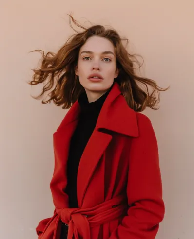 This cherry red trench coat is the ultimate statement piece for any wardrobe. With its dramatic lapels, tie-waist belt, and rich hue, it s a stunning mix of classic design and bold color. Worn over a sleek black turtleneck, this outfit radiates effortless sophistication. The minimalist black underlayer lets the red coat truly shine, making it perfect for city strolls or a chic evening out.