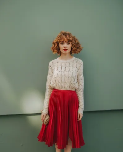 What I adore about this outfit is how beautifully the rich red skirt contrasts with the soft cream sweater. It s the perfect mix of bold and approachable like you re stylish without trying too hard. The pleats add just the right amount of movement, making you feel like you re gliding through the day. Honestly, this look is proof that you don t need anything over-the-top to stand out; sometimes, simple is stunning!