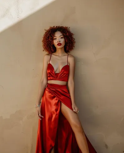 This cherry red satin two-piece outfit is nothing short of show-stopping. Featuring a strappy crop top with a plunging neckline and a high-slit maxi skirt, it s the perfect mix of sultry and sophisticated. The silky fabric catches the light beautifully, creating an elegant shimmer with every movement. Paired with strappy metallic heels and delicate bracelets, this look is made for evening events where you want all eyes on you.
