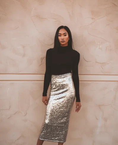 This outfit is all about sleek, modern elegance with a touch of holiday sparkle. The fitted black turtleneck provides a chic, understated base, while the high-waisted gold sequin midi skirt takes center stage with its dazzling shine. Paired with silver pointed-toe heels, this look balances simplicity and glamour effortlessly, making it perfect for holiday parties or New Year s Eve celebrations.