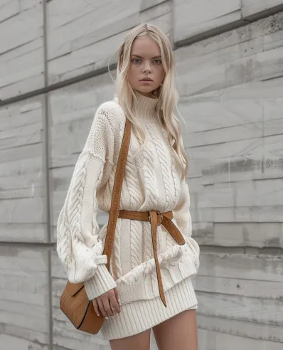 This cream cable-knit sweater dress is the perfect blend of comfort and style. The oversized fit is cinched at the waist with a brown leather belt, adding structure and a flattering silhouette. Paired with knee-high brown leather boots and a matching crossbody bag, this look feels effortlessly cozy yet pulled-together. It’s ideal for casual holiday outings, Christmas markets, or a cozy coffee date during the festive season.