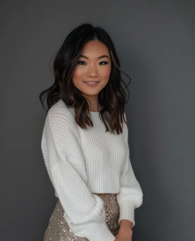 This outfit strikes the perfect balance between festive sparkle and cozy comfort. The white knit sweater with relaxed balloon sleeves is effortlessly chic and oh-so-comfy for chilly weather. Pairing it with a gold sequin mini skirt creates a dazzling contrast, adding just the right amount of glam for a Christmas party or holiday gathering. The knee-high socks give the look a playful, youthful vibe, making it feel fun yet polished.