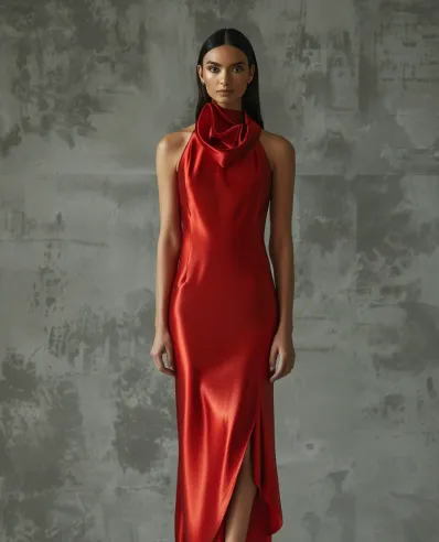 This red satin dress is pure elegance with a modern edge. The halter neckline features a dramatic draped cowl detail that adds a sophisticated twist to the classic holiday color. The figure-skimming silhouette and mid-thigh slit create a sleek, elongated look, while the soft satin fabric adds a luxurious sheen. Styled with black pointed-toe heels, this outfit is perfect for a formal Christmas event or a glamorous New Year s Eve soirée.