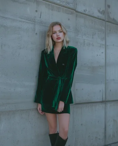 What I adore about this outfit is how it takes classic holiday elements velvet and green and gives them a contemporary twist. The blazer dress is a power move in itself, but the boots take it to a whole new level of cool. It s chic, confident, and just a little bit rebellious like saying, Yes, I m here to party, but I m also in charge of my own fun.â It s perfect for when you want to stand out in all the right ways.