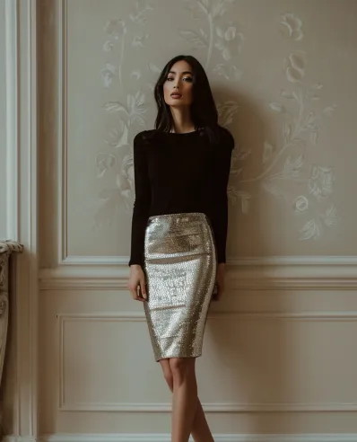 This outfit combines classic minimalism with a festive twist. The fitted black long-sleeve top provides a sleek, understated base, letting the silver sequin pencil skirt take center stage. The high-waisted skirt shines with every movement, adding just the right amount of holiday sparkle. Paired with silver pointed-toe heels, this look is the perfect balance of glamour and sophistication, ideal for a holiday dinner or an office Christmas party.
