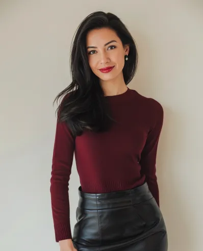 This outfit is effortlessly chic with just the right touch of edge. The fitted burgundy sweater brings a cozy yet polished vibe, while the black leather mini skirt adds a bold, modern twist. The combination of textures soft knit and sleek leather creates an eye-catching contrast. Pair it with pearl earrings and a bold red lip for an extra dose of elegance. This look is perfect for a casual holiday gathering or a night out with friends.