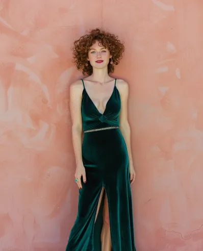 This emerald green dress is pure elegance with a touch of sultry charm. The soft velvet fabric gives off a rich, luxurious vibe, catching the light beautifully. It features a deep V-neckline, delicate spaghetti straps, and a subtle crystal waistband that adds a hint of sparkle. The thigh-high slit not only brings a daring edge but also makes the dress easy to move in. Paired with dainty heels and a bold lip, this outfit is perfect for dancing the night away at a Mardi Gras party.
